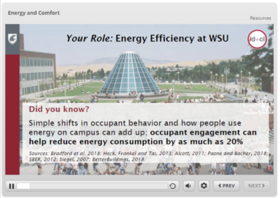 In the fall of 2020, the Integrated Design + Construction Laboratory issued a survey to the entire WSU community about comfort, energy use, and learning styles. We discovered that many participants did not understand how or when to make energy-conscious decisions to improve their comfort. Over 65% of participants indicated that online training would help them maintain comfort and reduce energy use, so based on your feedback, we’ve developed an Energy and Comfort Training module, which is now hosted on the HRS learning platform, Skillsoft. We encourage you all to take this training, which should take you about 45 minutes. Copy and paste the following link, or press the red text below. https://share.percipio.com/cd/9MTN_8hnV